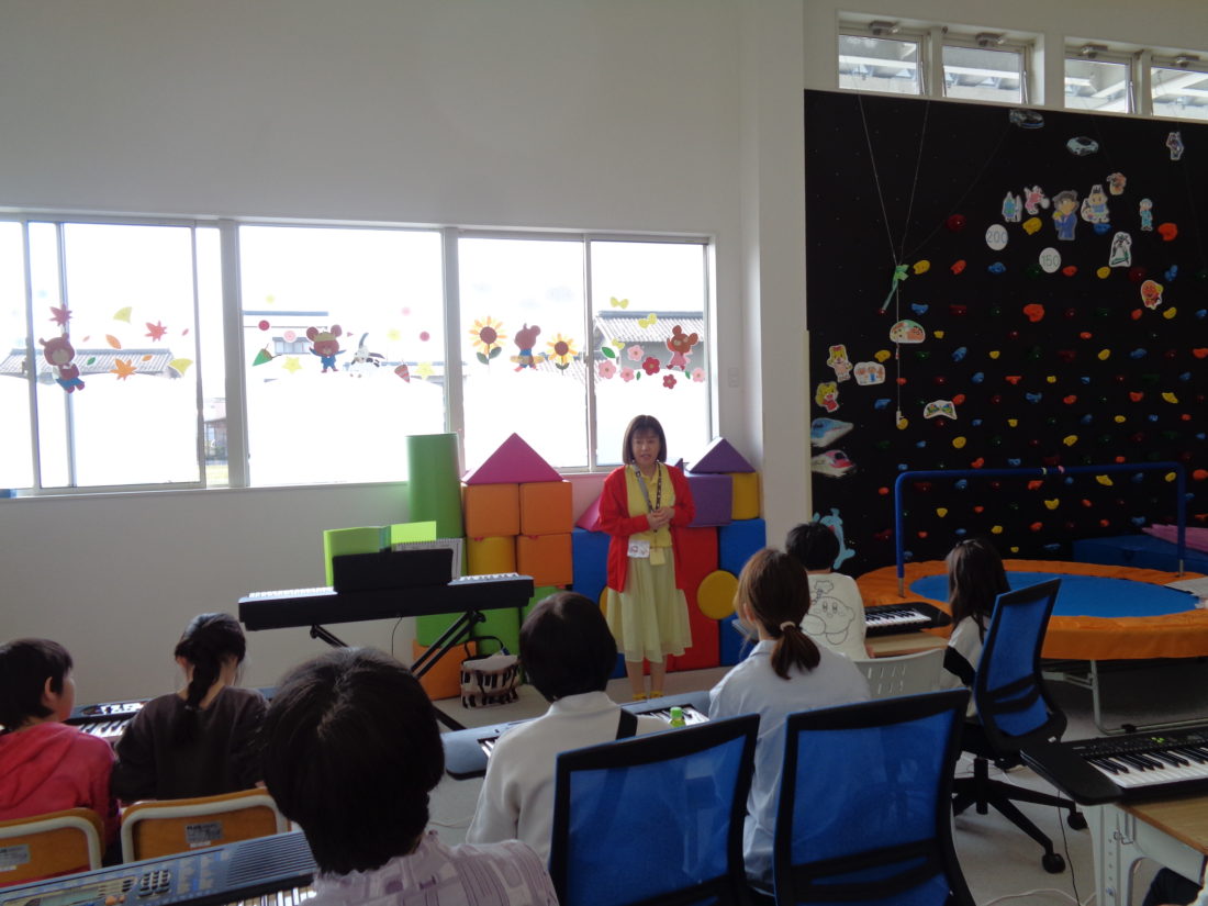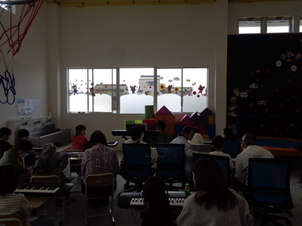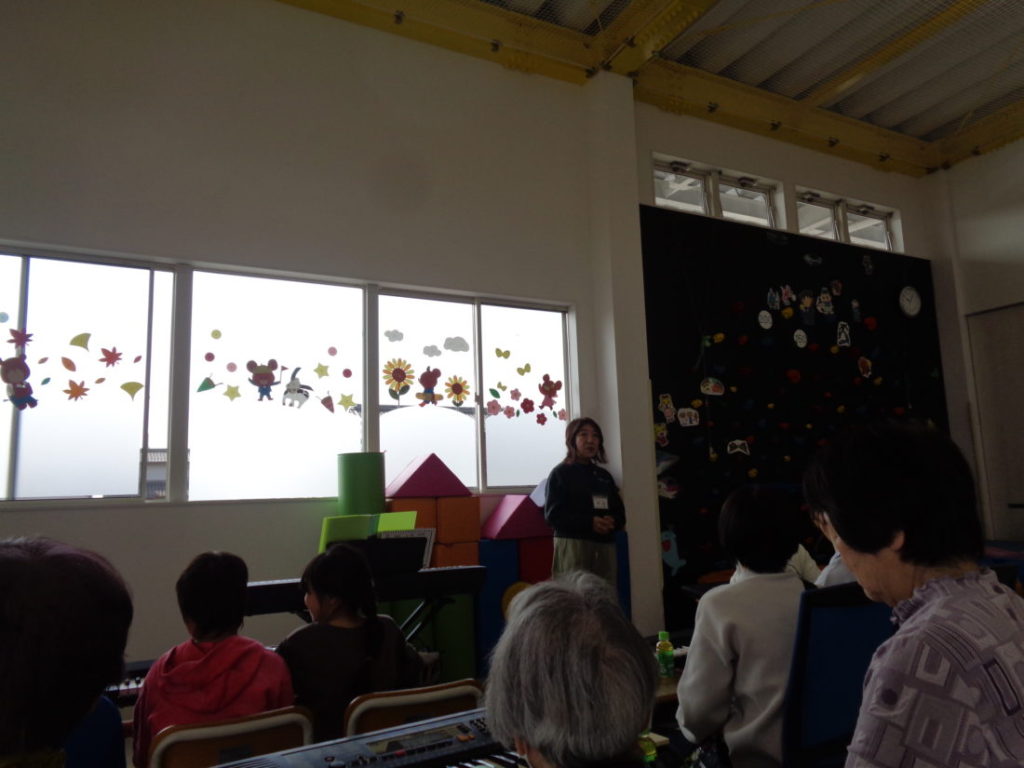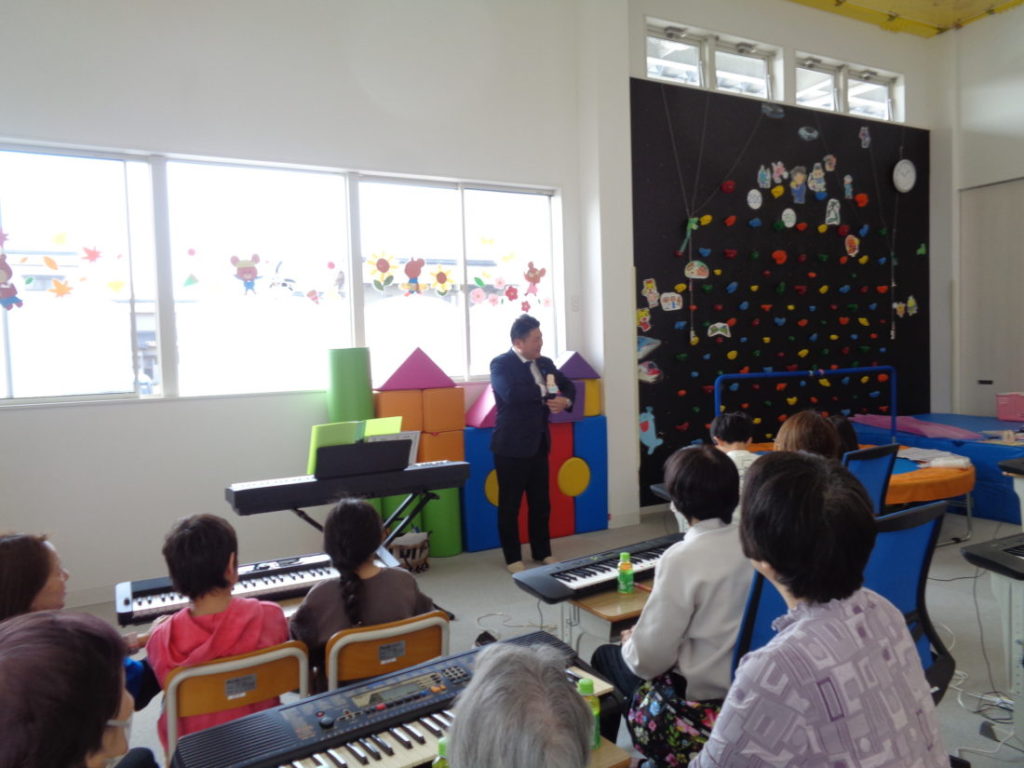 キッズの子ども達と保護者、祖父母の方、地域のシニアの方も招いて、シニアの音楽教室を開催しました。講師は、林楽器ミッキースクールの皆様。
