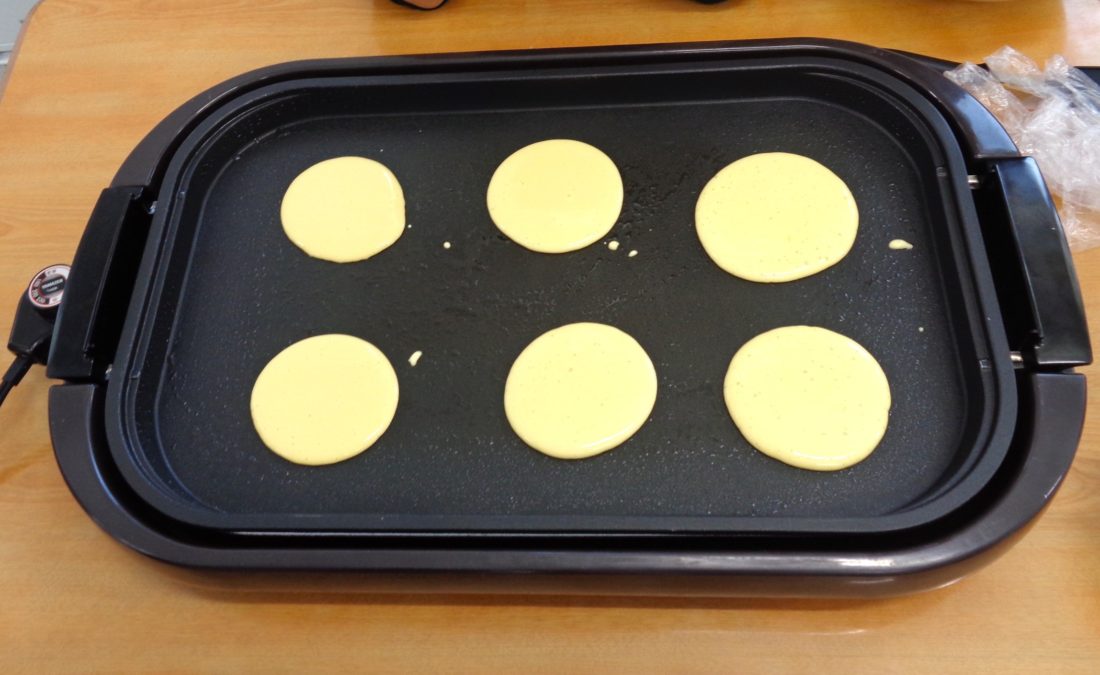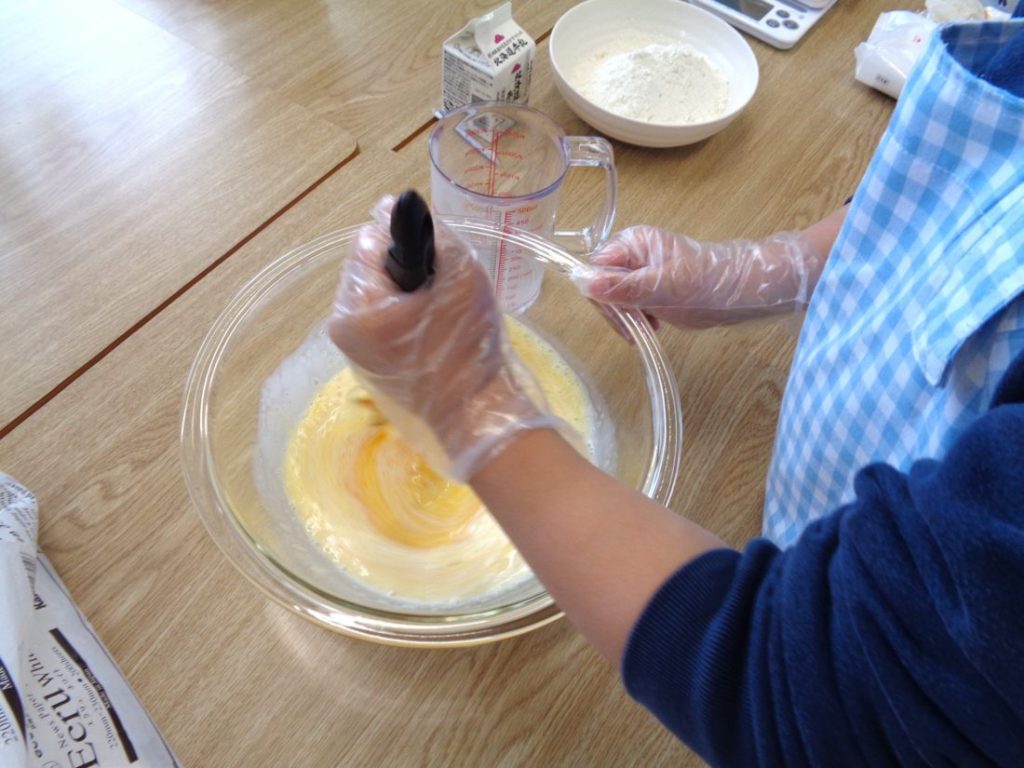 卵を割ったり、砂糖などをを混ぜる子たち、ホットケーキミックスや牛乳などを計る子たち。