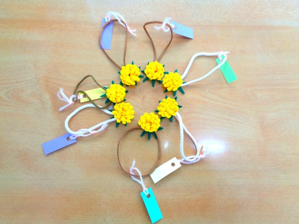 ギザギザと細長くに切った黄色のフェルトをくるくると丸めていくと、