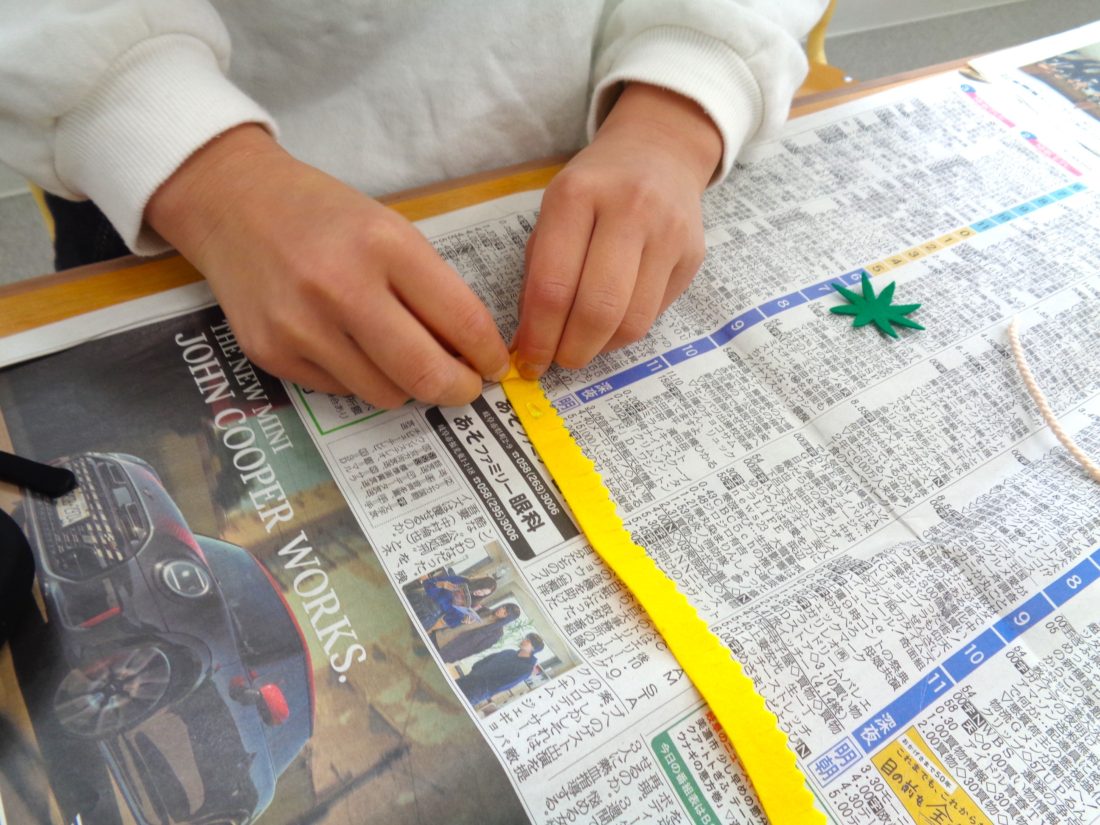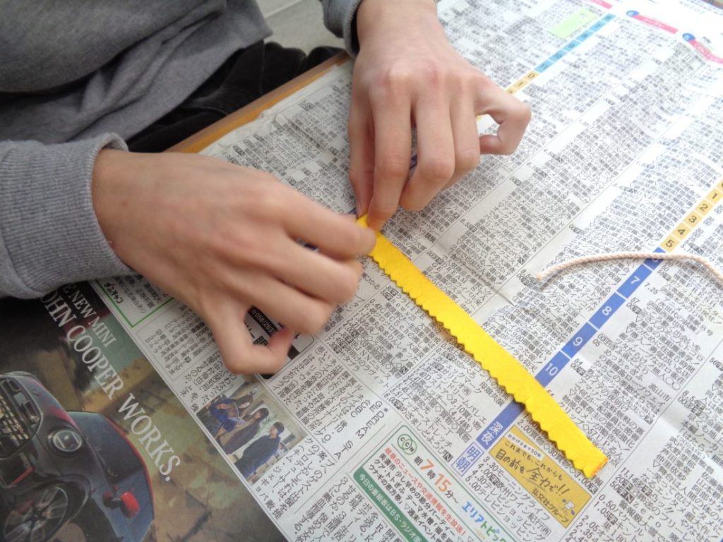 ギザギザと細長くに切った黄色のフェルトをくるくると丸めていくと、