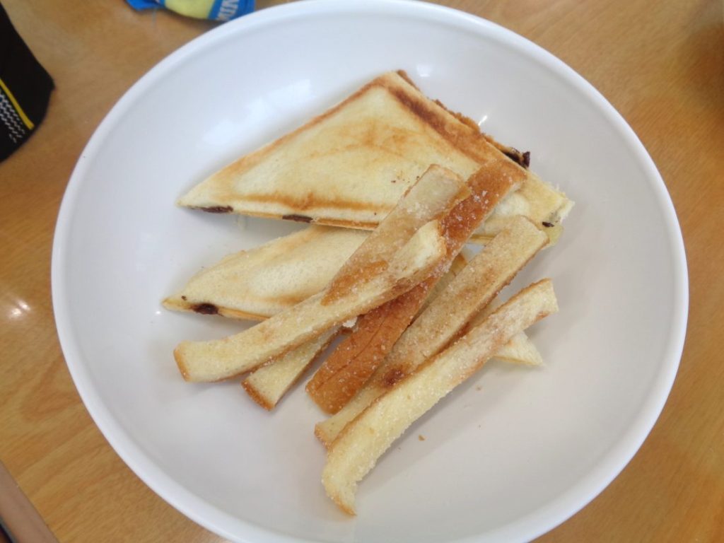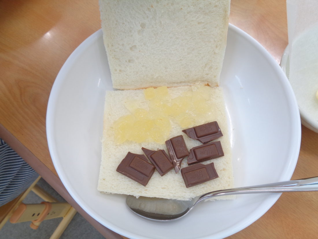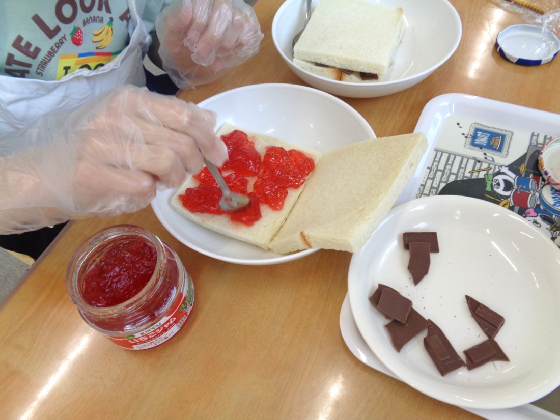 2026年3月21日 / 最終更新日時 : 2026年4月2日 放課後等デイサービス ホットサンドスイーツ作ろう ホットサンドスイーツを作りました。あんこ、いちごジャム、リンゴジャム、チョコの4種類の中から好きな具を2つ選びました。盛りだくさんにパンの上にのせています。切ったパンの耳は余すことなくラスクにして、お腹いっぱいになってしまいましたが、楽しくクッキングが出来ました♪