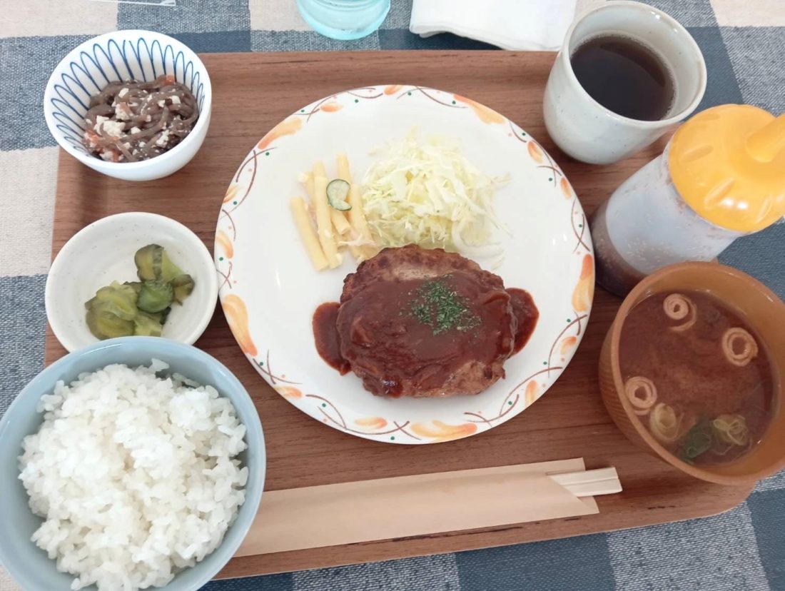 山県市図書館にて行われている「ふれあい教育展」の見学に行きました。ひな飾りがすてき。みなさんの作品を鑑賞したあと、レインボーハウスで、ランチ。日替わりメニューのハンバーグ定食、定番のカレー、好きなお肉。生姜焼き定食。思い思いのメニューを選択して、」食べました。