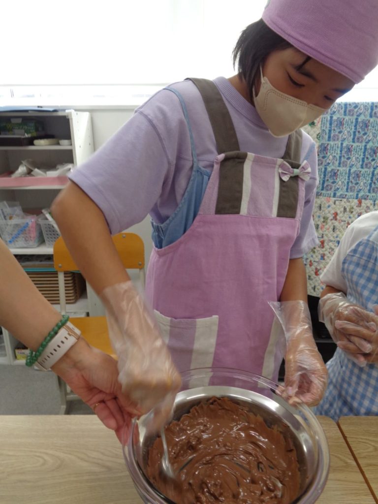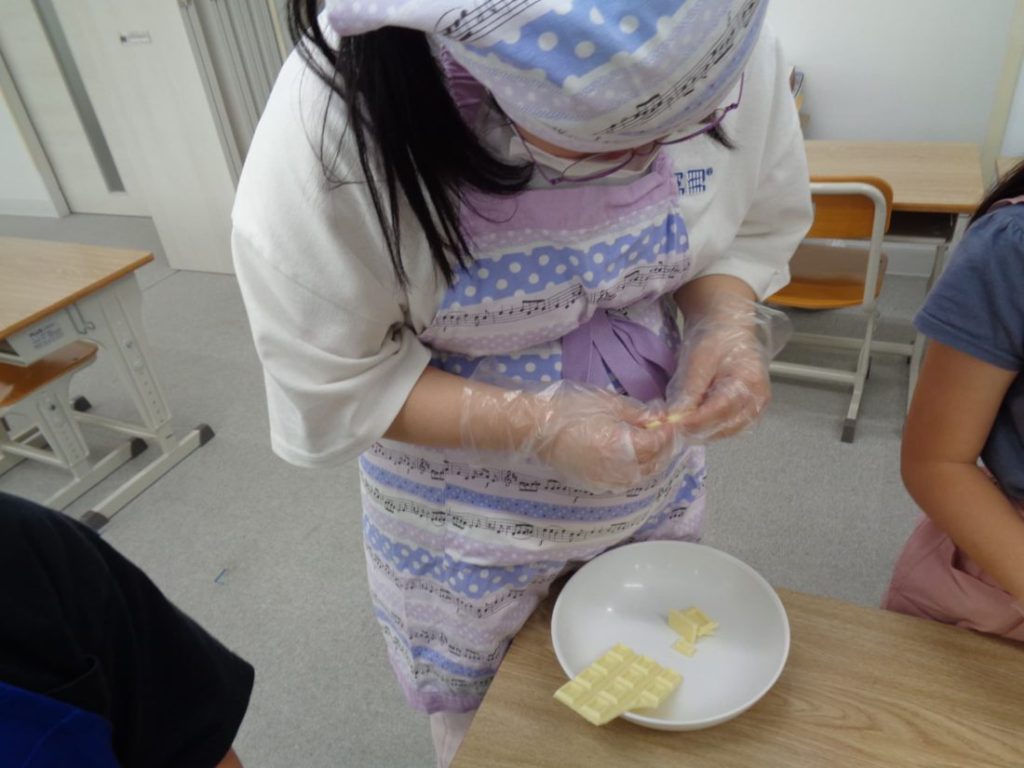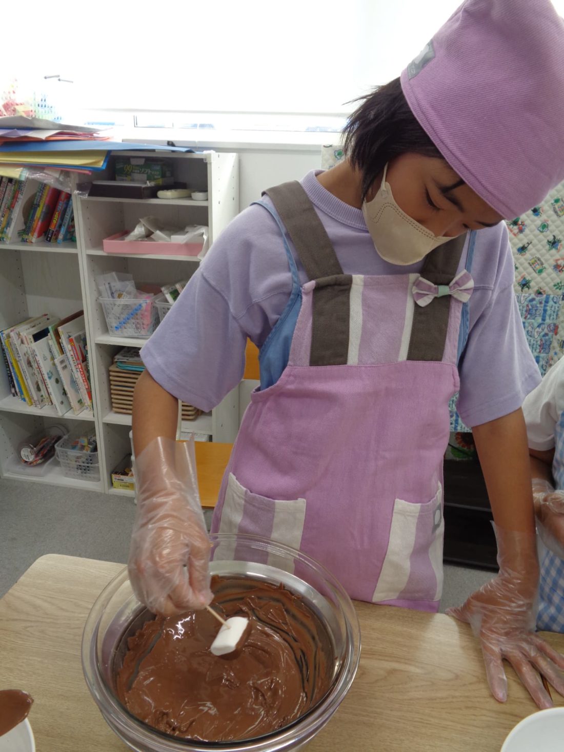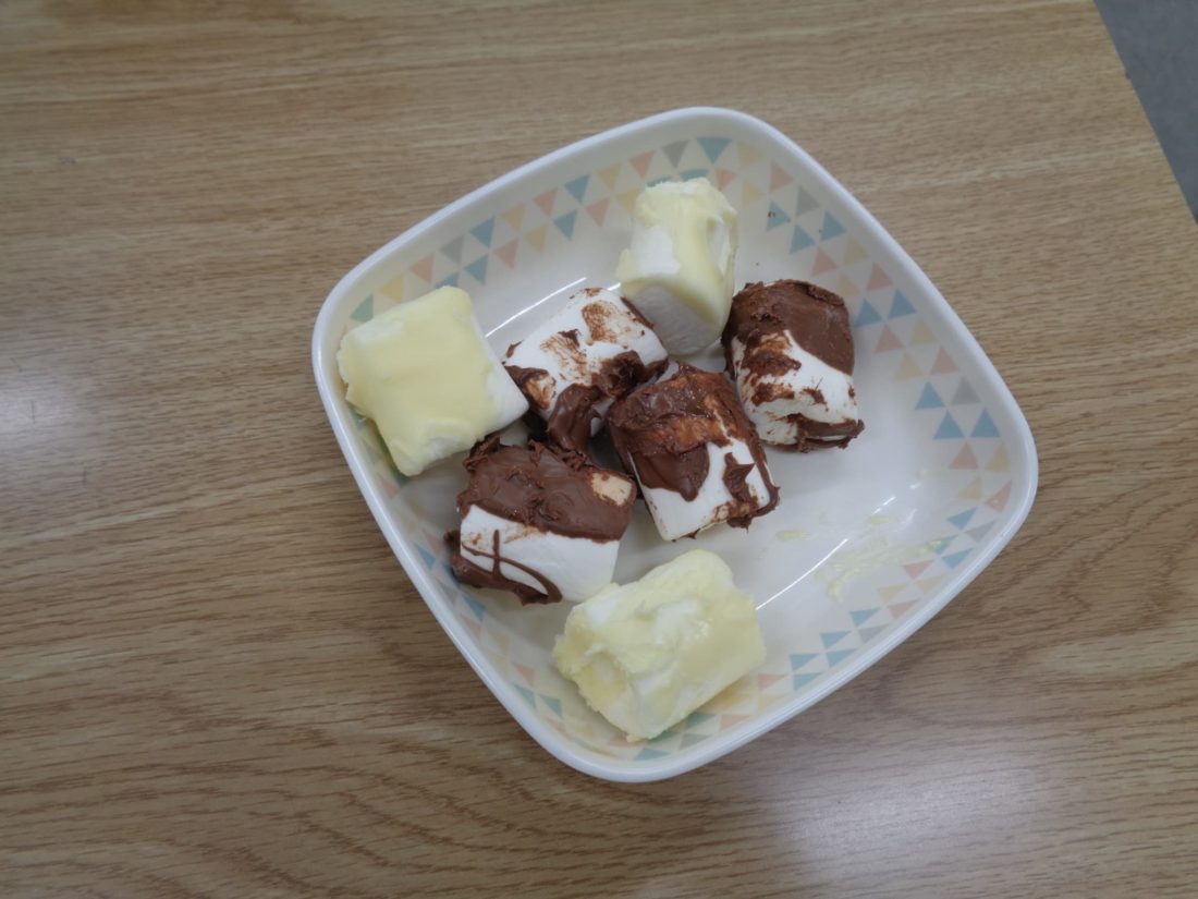 ミルクとホワイトの2色のチョコレートを溶かしてマシュマロに付けて食べた。チョコレートを細かく割っていくのを一斉に行うとみんなで競うように楽しんで行っていた。マシュマロに爪楊枝を刺して溶かしたチョコレートを付けていくと、柔らかくなったチョコレートを恐る恐る付けながらお皿に並べ、「早く固まらないかな?」と食べるのを待ち遠しそうにしていた。完成したチョコマシュマロが机に並ぶと、皆大喜びで口に頬張っていた。