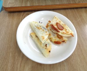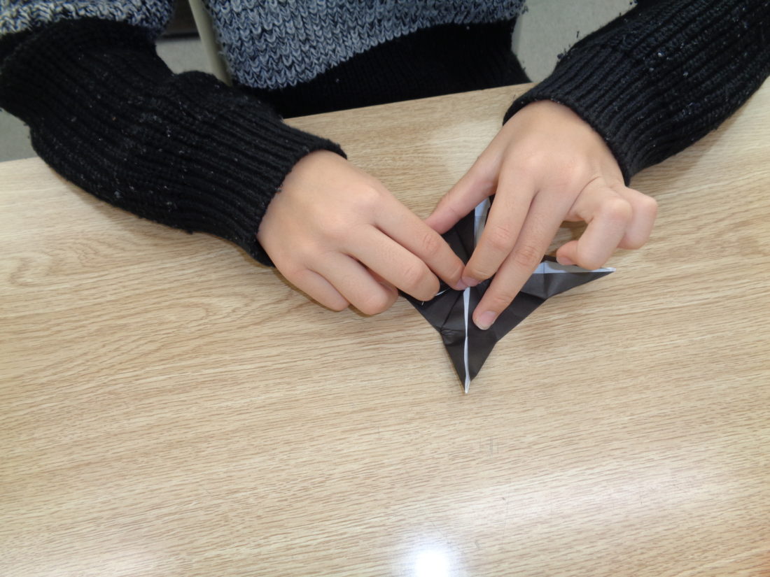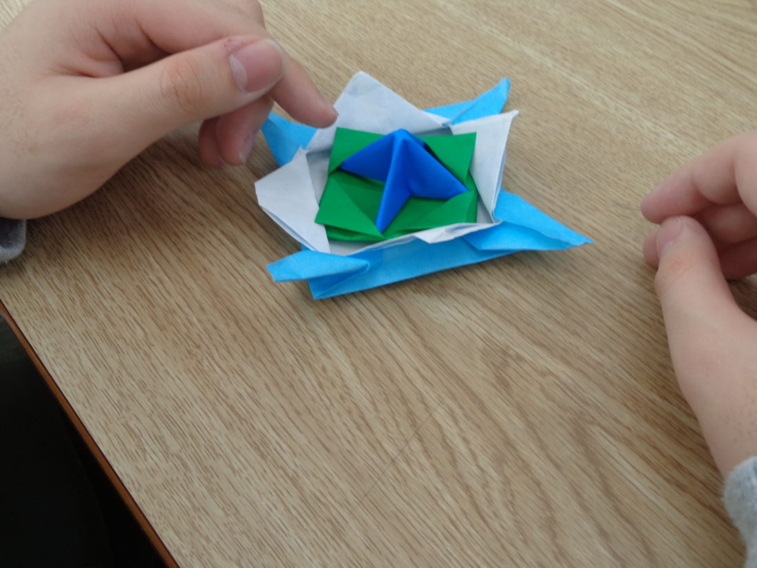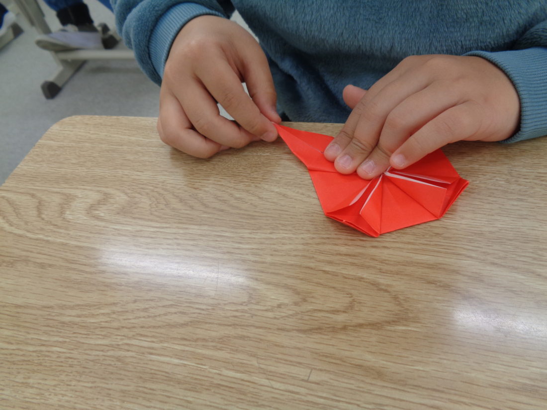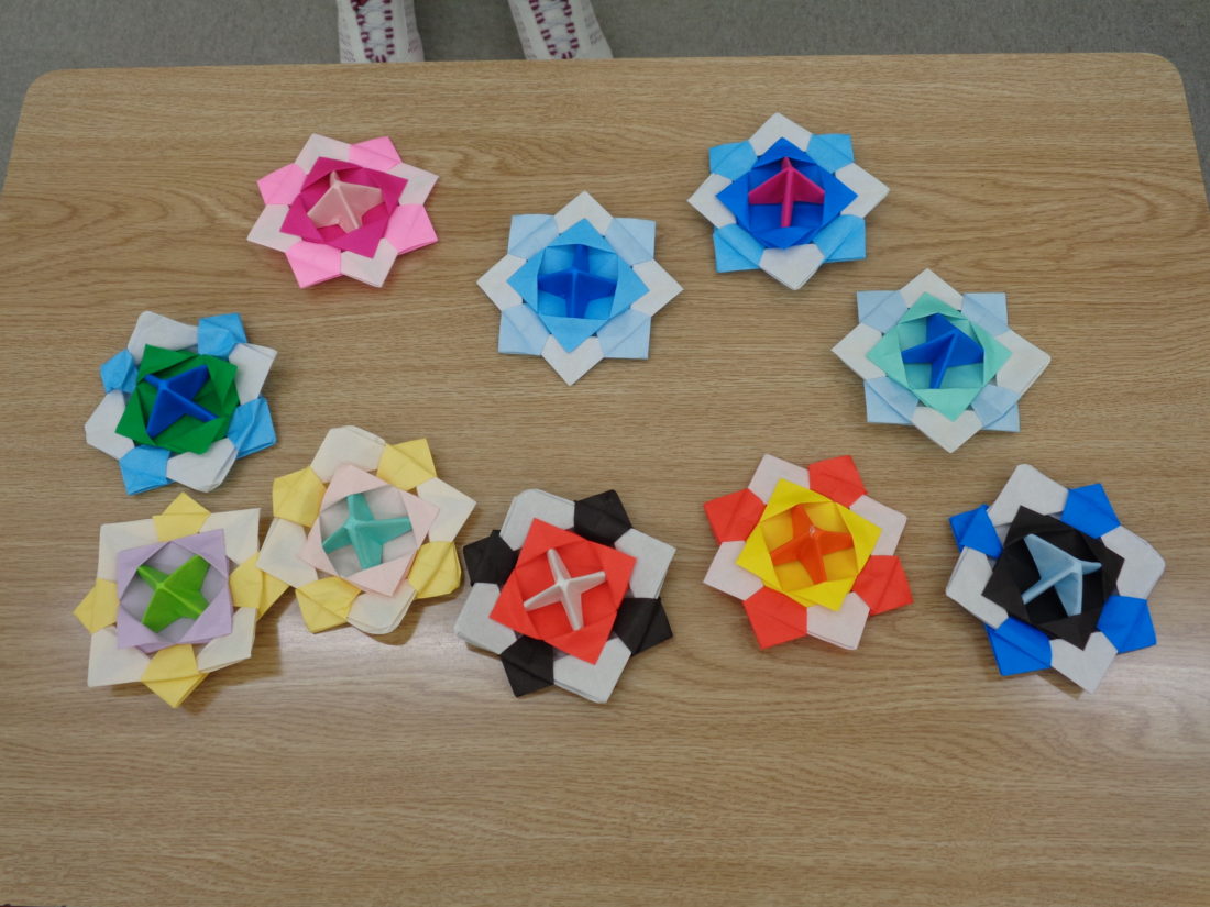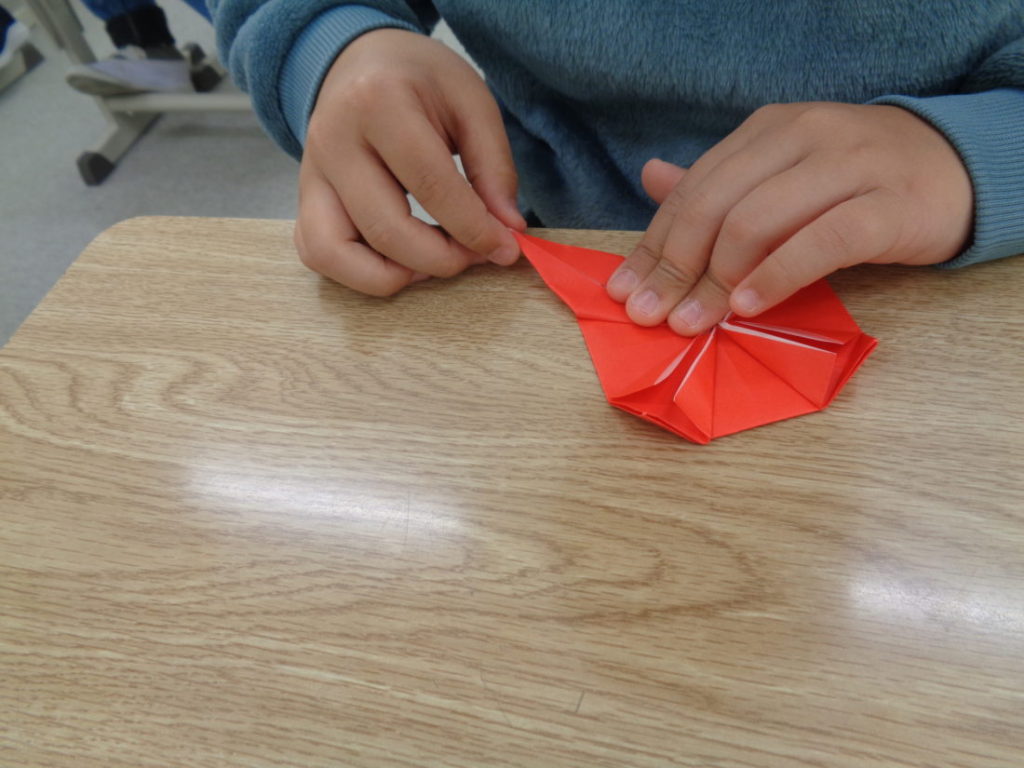 折り紙3枚使用し、コマを作りました。中央の簡単な折り方から段々難しい折り方を折っていき、事前に難しい折り方であることを伝えると、皆意識して聞くことができ、1人で折る事が出来ています。各パーツが完成して組み立てる工程は、どの子も集中して完成を楽しみにしながら組み立てていました。コマが完成すると、「もう1個!」と何個も作る子も居ました。お昼から4分の1サイズの折り紙で挑戦し、とても小さく難しかったですが、午前中の折り方を覚えている子は一人でスイスイと折っています。