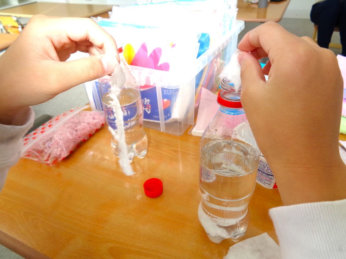紙の元なるケナフを水に浸した後にちぎったり、花紙や毛糸を細かくしたりと