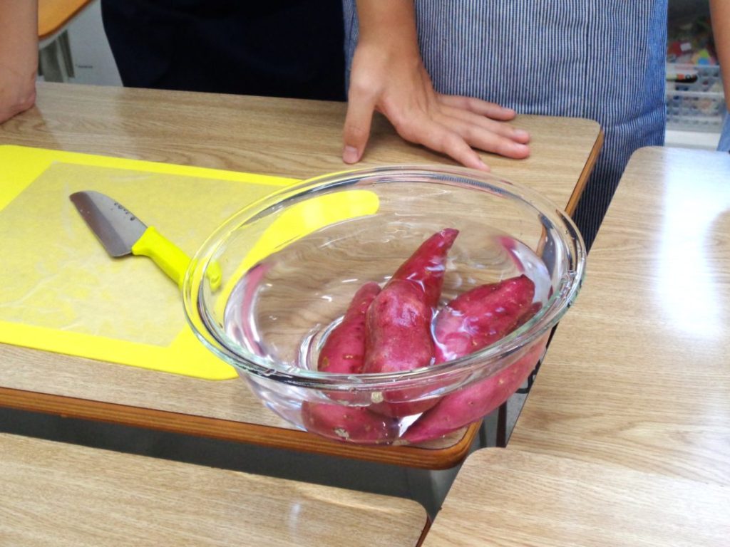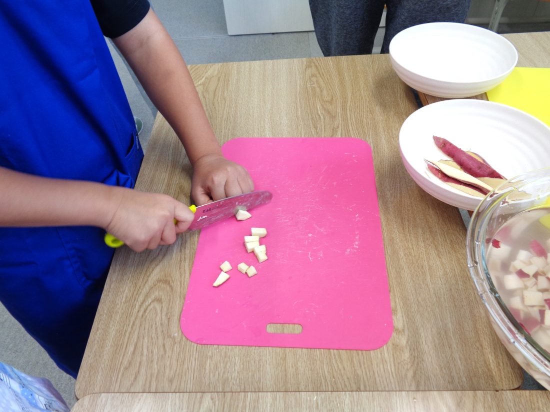 秋の味覚のさつまいもを使って、さつまいもご飯を作りました。さつまいも掘りをしたことがある子が多くどの子も見たことがあり、どんな御飯になるのか想像を膨らませて楽しみにしているようです。堅いさつまいもを切るのに一苦労する子ども達でしたが、慣れてくると猫の手も出来るようになり、リズム良く切る音が聞こえてくるようになりました。食べる前に「食べれない。」と言っていた子も食べ始めると何杯もおかわりしています。味覚の秋を堪能できた活動でした。