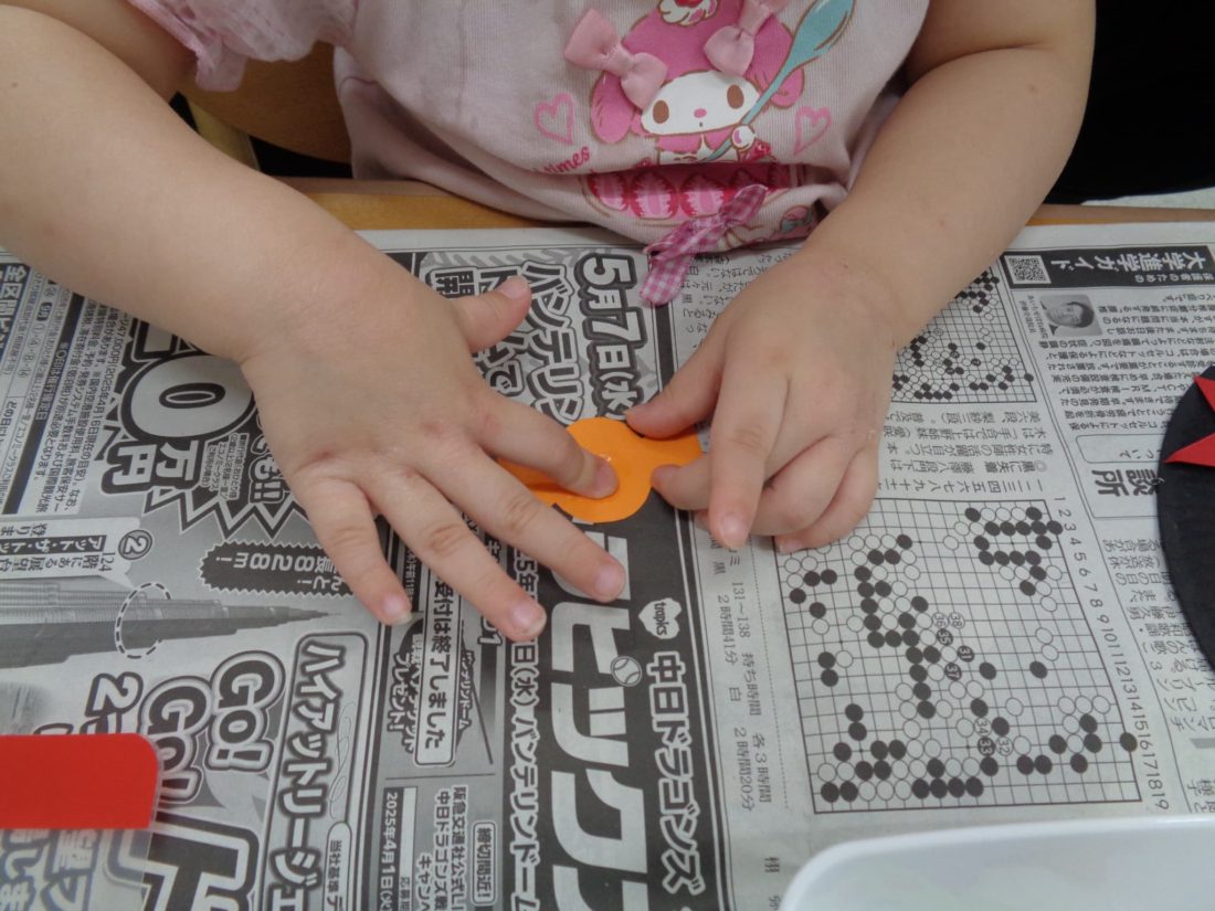 のりを指につけて、“なんだこれ?”とばかりに指先を真剣に凝視する子。