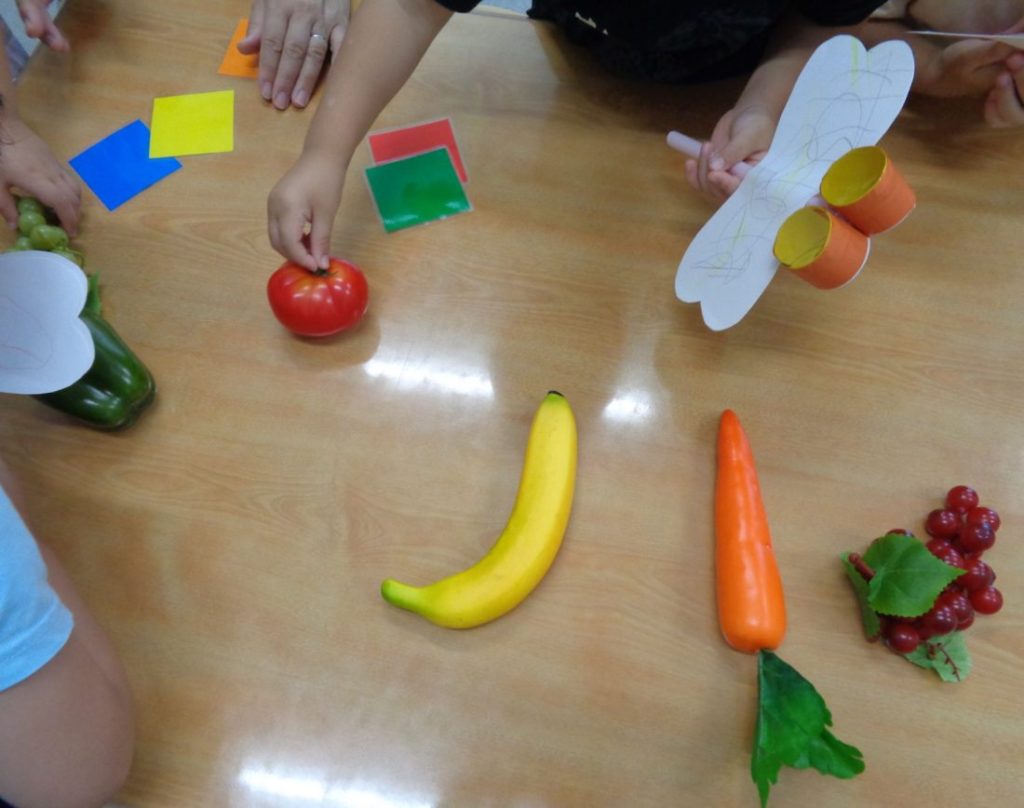 とんぼのめがねからのぞき込むと「先生が赤いよ!」「ピーマンが黒くなっちゃった!」といつもと違う色に驚く子どもたちです。