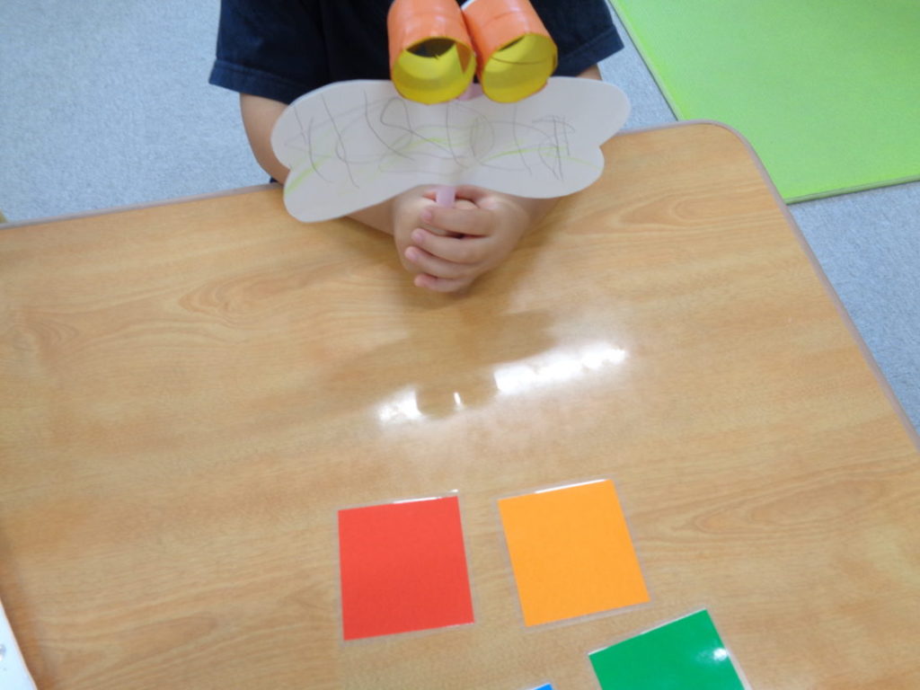 とんぼのめがねからのぞき込むと「先生が赤いよ!」「ピーマンが黒くなっちゃった!」といつもと違う色に驚く子どもたちです。