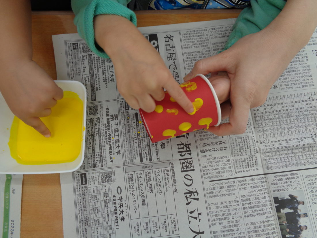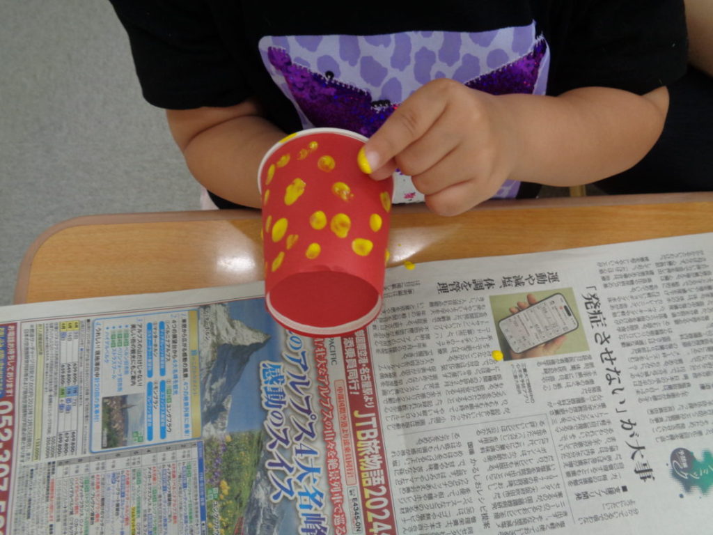 2026年3月4日 / 最終更新日時 : 2026年4月2日 児童発達支援 いちごフィンガーペイント いちごの制作を行いました。 「いちの指でぺったんだよ」というと「いち!」といって指を見せてくれる子どもたち。 絵の具の感触を確かめるように何度もぺったんぺったん…。 紙コップをくるっと回してまたぺったんぺったん…。 おいしそうないちごができあがりました。
