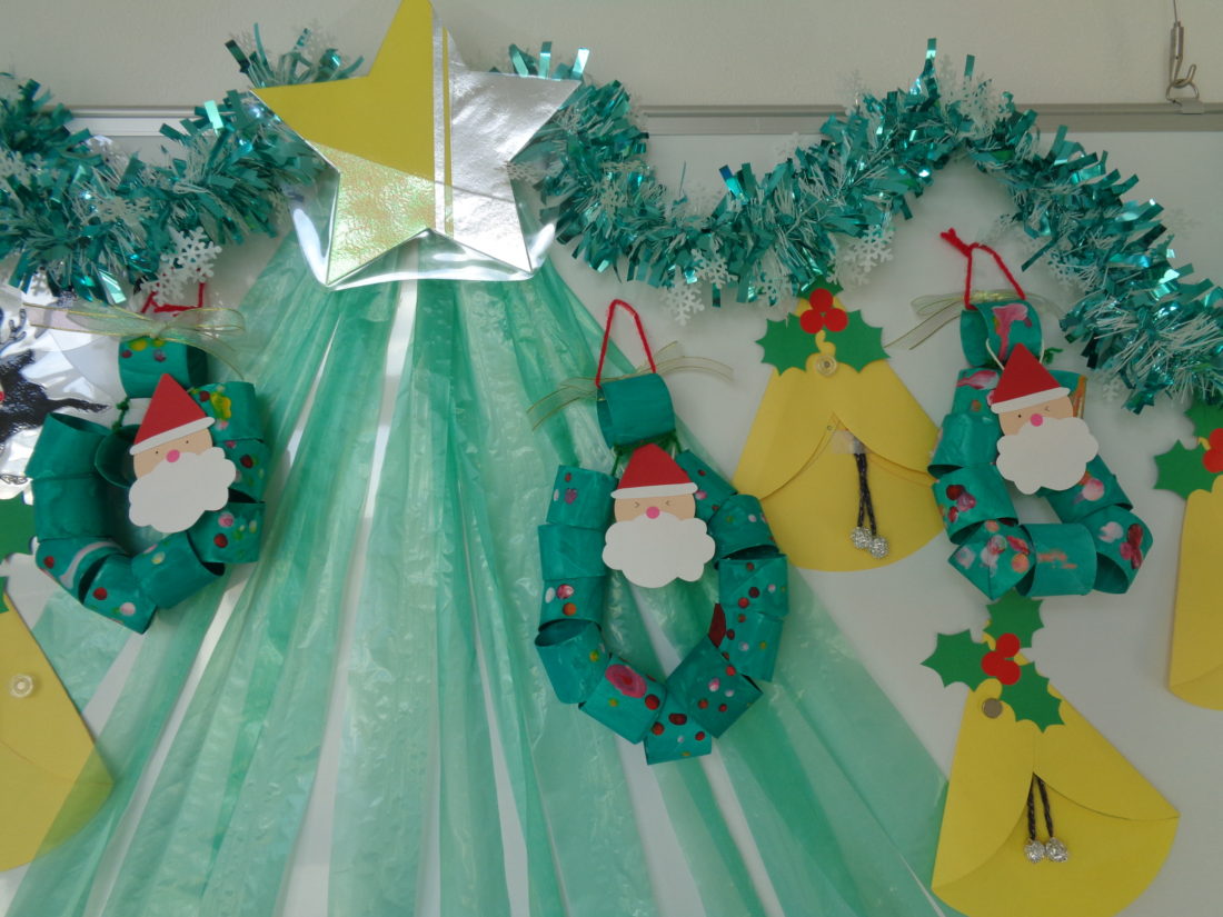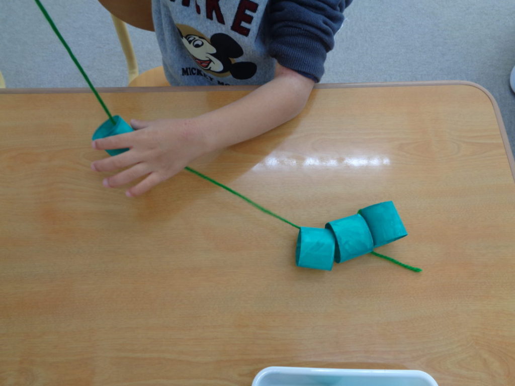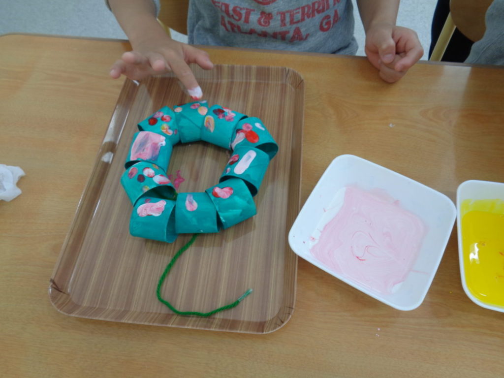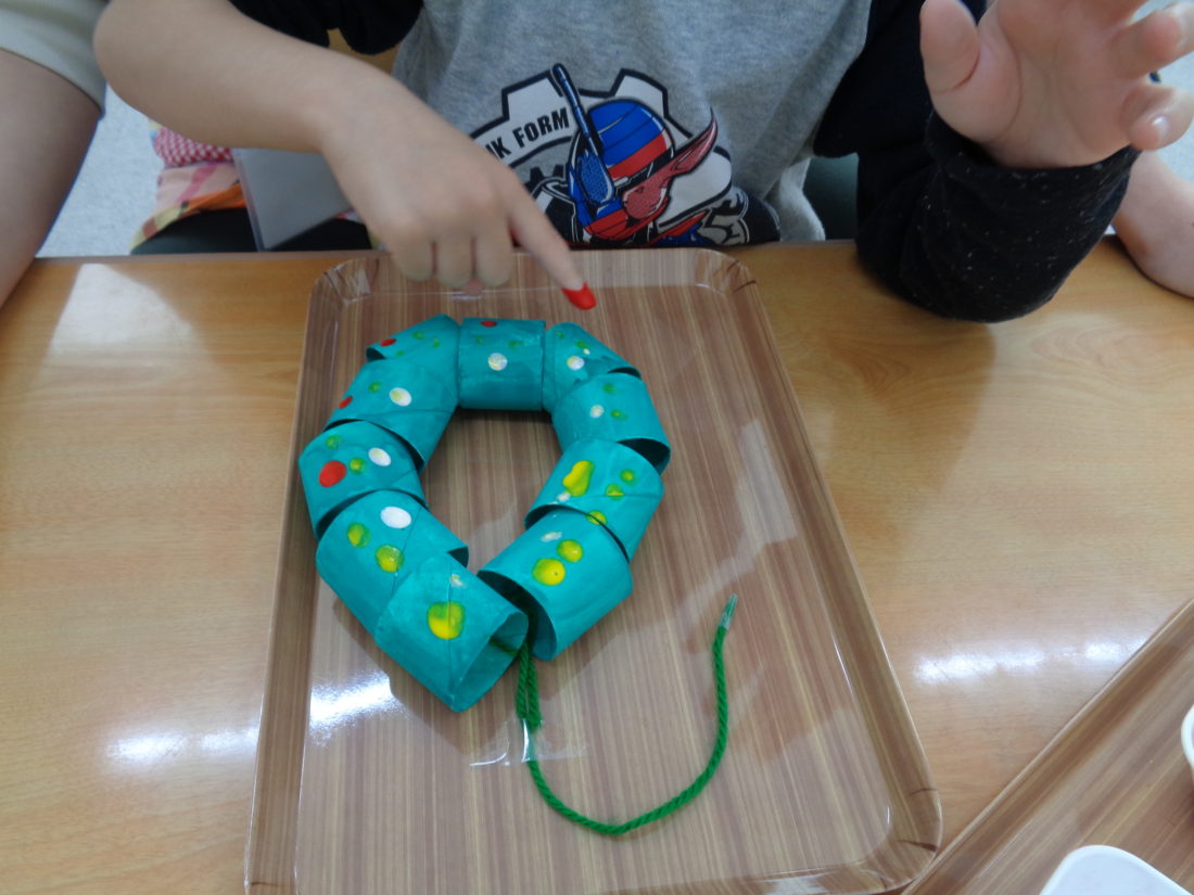 2025年12月12日 / 最終更新日時 : 2026年1月8日 児童発達支援 クリスマスリース クリスマスリースの制作を行いました。 「サンタさんにお手紙書いたよ!」「ツリーが飾ってあるよ!」とクリスマスが近づき、わくわくする子どもたち。 輪っかをひもに通してリースの形にしました。 飾りつけは、フィンガーペイントでちょん、ちょん、とつけていきます。 色が混ざると違う色になることに気づき、「赤と黄色を混ぜてみよう!」と夢中でスタンプしました。 サンタさんがくるのが待ち遠しいですね。