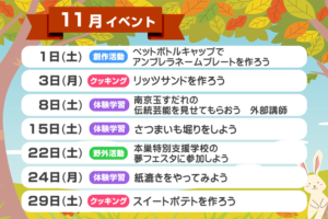 2025年9月19日 / 最終更新日時 : 2025年9月19日 お知らせ 土曜日・祝日のイベント案内【10月】 キッズウェイブでは土曜日と祝日に、学校休業日にしかできない「創作活動」「クッキング」「ミニ遠足」といった各種イベントを実施しています。10月も盛りだくさんに計画しています。