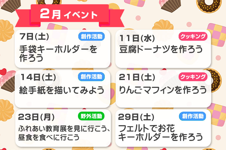 2026年1月21日 / 最終更新日時 : 2026年1月21日 お知らせ 土曜日・祝日のイベント案内【2月】 キッズウェイブでは土曜日と祝日に、学校休業日にしかできない「創作活動」「クッキング」「ミニ遠足」といった各種イベントを実施しています。2月も盛りだくさんに計画しています。