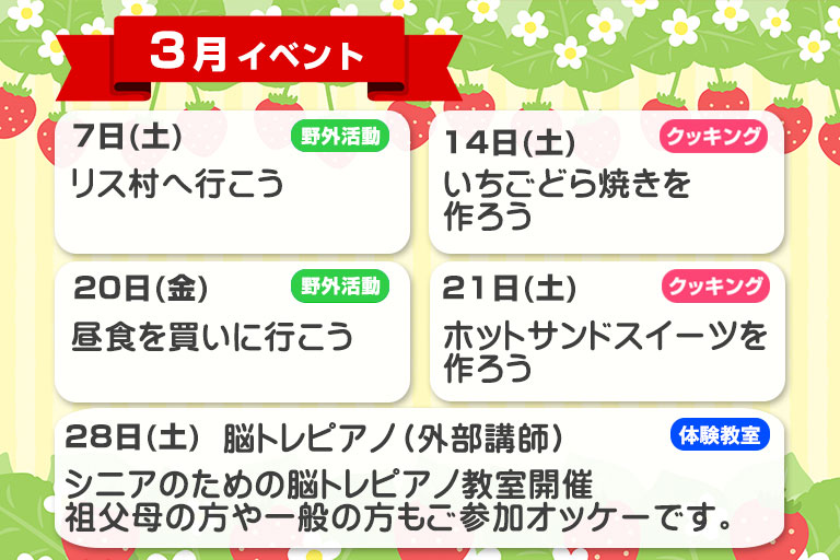 2026年2月20日 / 最終更新日時 : 2026年2月20日 お知らせ 土曜日・祝日のイベント案内【3月】 キッズウェイブでは土曜日と祝日に、学校休業日にしかできない「創作活動」「クッキング」「ミニ遠足」といった各種イベントを実施しています。3月も盛りだくさんに計画しています。