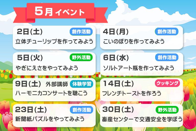 2026年4月20日 / 最終更新日時 : 2026年4月20日 お知らせ 土曜日・祝日のイベント案内【5月】 キッズウェイブでは土曜日と祝日に、学校休業日にしかできない「創作活動」「クッキング」「ミニ遠足」といった各種イベントを実施しています。5月も盛りだくさんに計画しています。